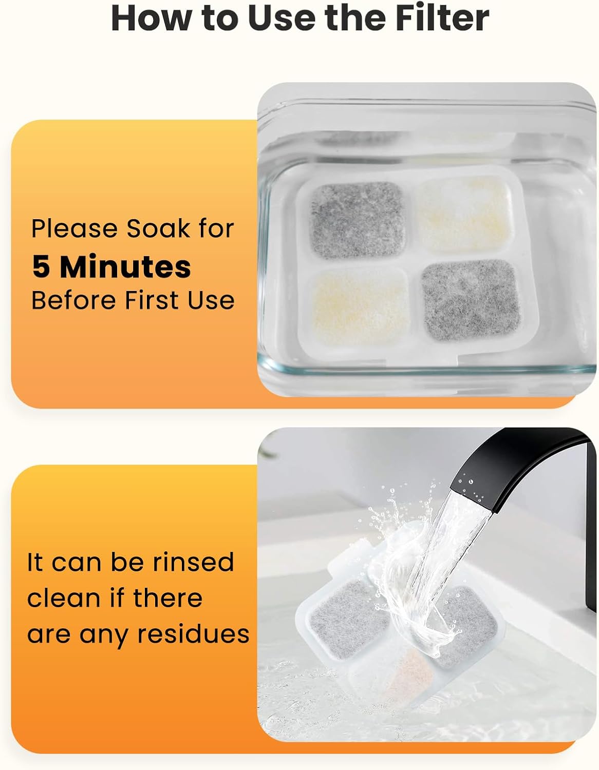 • Please soak the filter in water for 4 minutes and rinse it thoroughly under running water before use