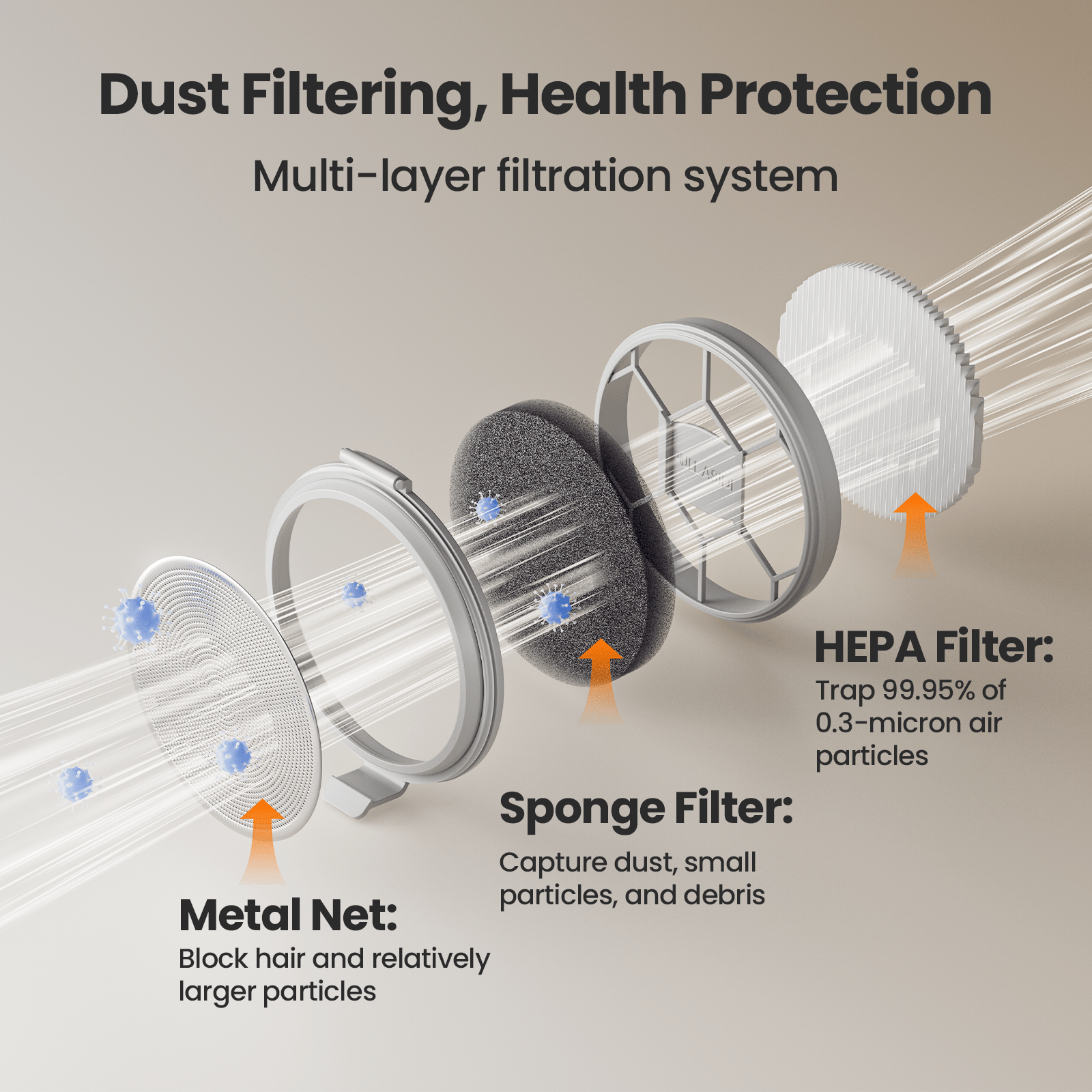 3. HEPA Filter: Filters out 99.97% of fine particles, including dust and allergens, ensuring cleaner air.